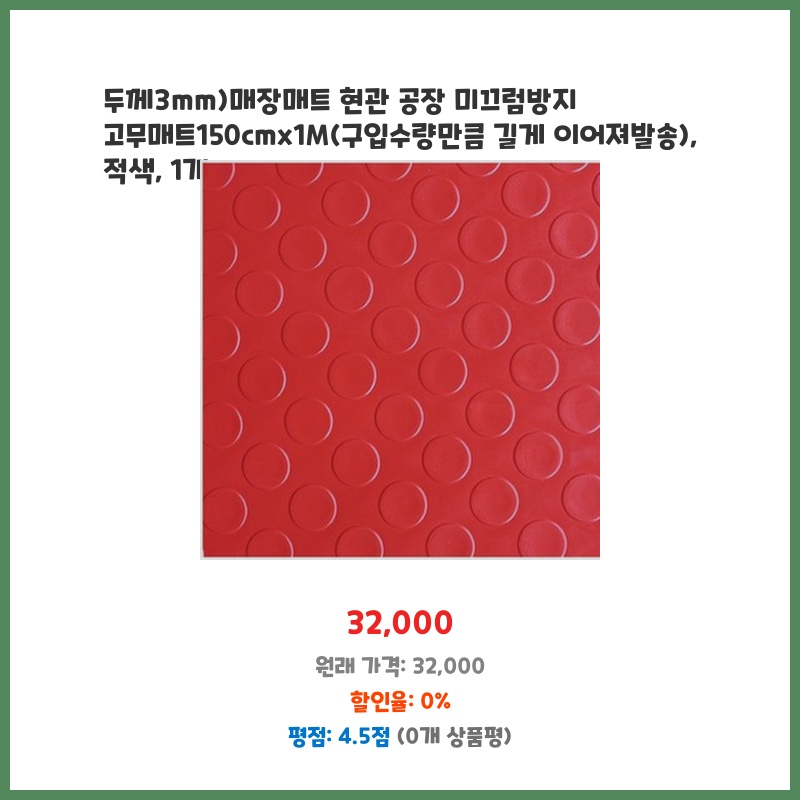 현관 입구에 놓을 미끄럼 방지 매트가 필요했습니다. 3mm 두께라 적당히 쿠션감이 있고, 150cm x 1m 사이즈라 현관문 앞을 충분히 커버할 것 같아 구매했습니다. 적색이라 시각적으로도 포인트가 되네요.
