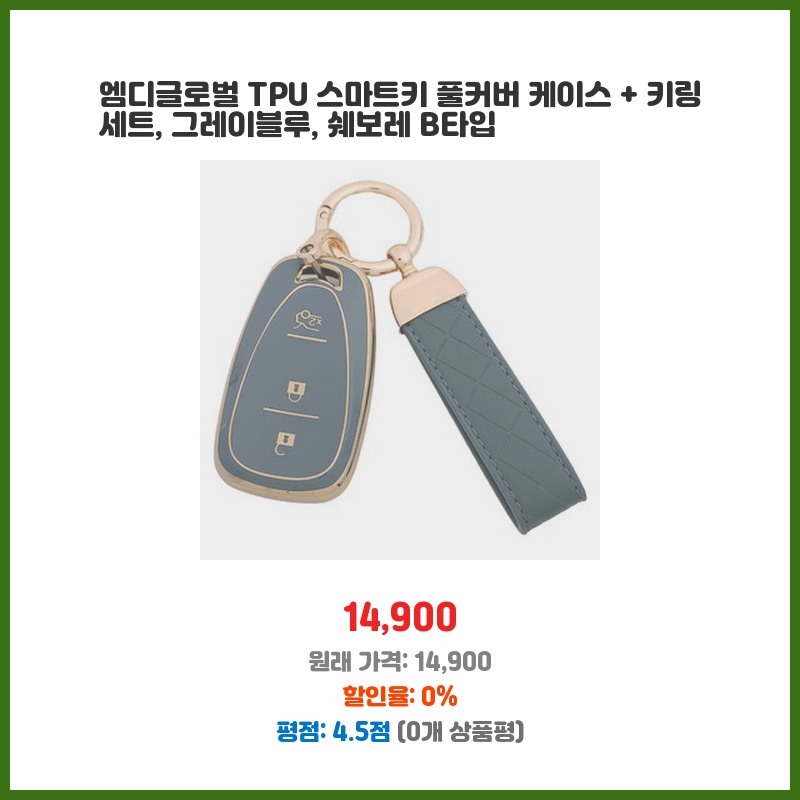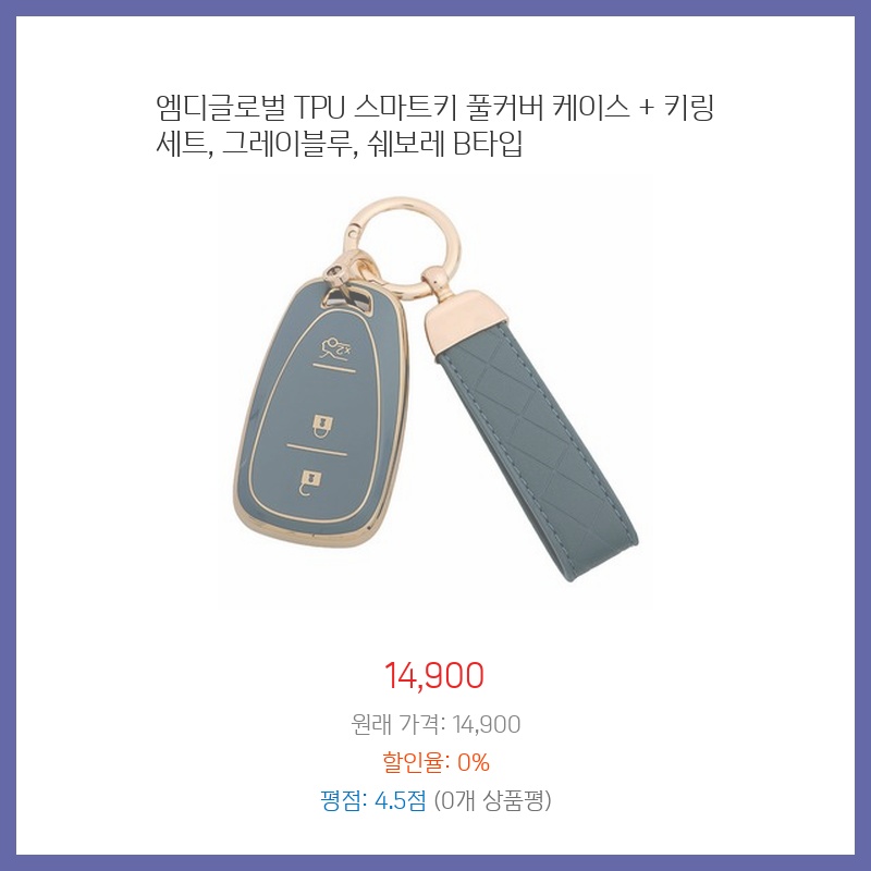 쉐보레 B타입 스마트키에 딱 맞는 TPU 소재 케이스라 흠집 방지에 좋을 것 같아 구매했습니다. 키링도 함께 제공되어 휴대성도 높아 보였습니다. 그레이블루 색상도 마음에 들었습니다.