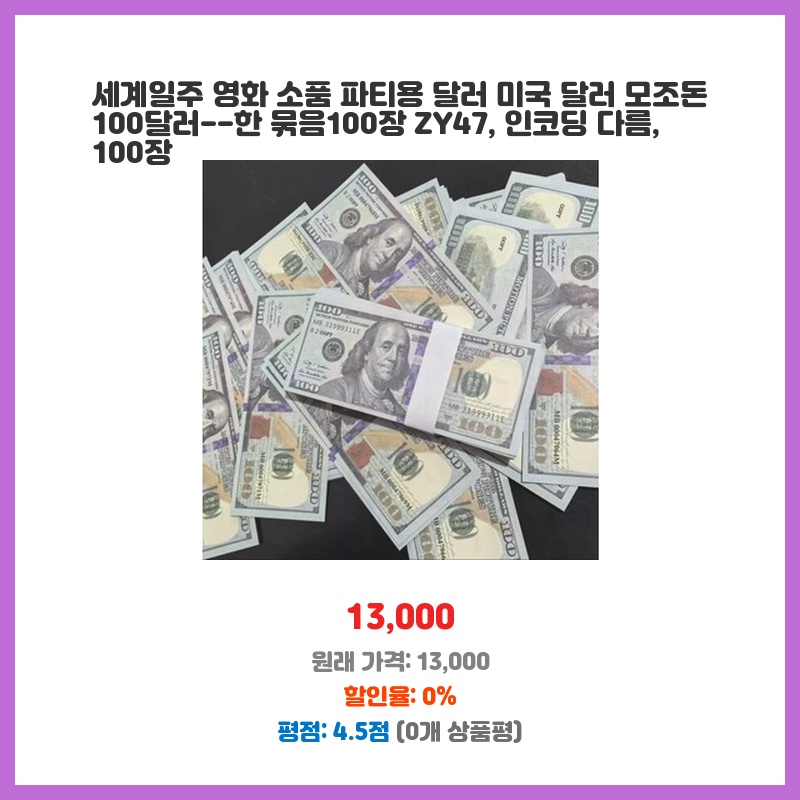 세계일주 영화 파티를 계획 중이라 소품으로 필요했습니다. 100장이라 양도 충분하고, 가격 대비 품질이 좋아 보여 구매했습니다. 모조돈이라 안전하게 사용할 수 있다는 점이 좋았습니다.