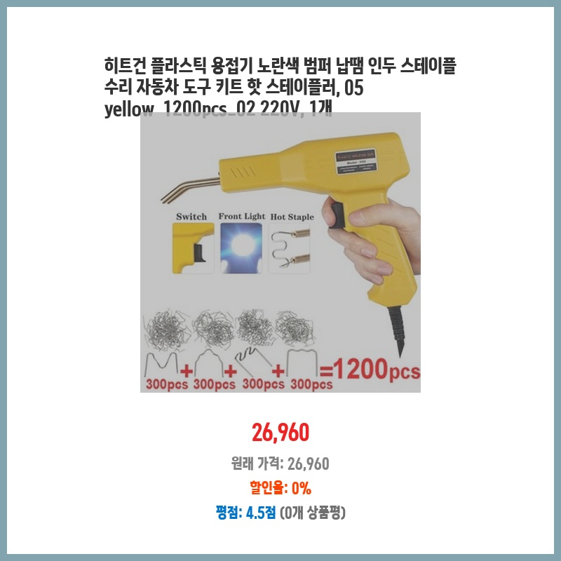 자동차 범퍼 수리에 필요한 용접기가 있어야 했는데, 이 제품은 스테이플과 납땜 기능이 함께 있어 편리해 보였습니다. 다양한 플라스틱 용접에 활용 가능하고, 합리적인 가격에 1200개의 스테이플까지 포함되어 있어 경제적이라고 판단했습니다.