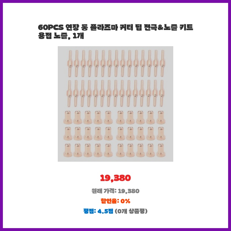 플라즈마 커터 팁과 전극, 노즐을 한꺼번에 60개나 구매할 수 있어 경제적입니다. 잦은 교체가 필요한 소모품이라 여러 개 준비하면 작업 효율이 높아질 것 같아 구매했습니다. 다양한 사이즈가 포함되어 있어 편리할 것으로 예상됩니다.