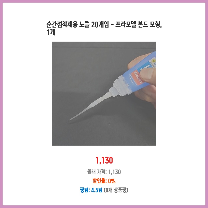 프라모델 작업 시 자주 사용하는 순간접착제의 노즐이 부족하여 구매했습니다. 20개나 들어있어 오랫동안 사용할 수 있고, 가격도 저렴하여 경제적입니다. 작은 부품 조립에 유용하며, 일반 노즐보다 정밀한 작업이 가능할 것 같아 기대됩니다.