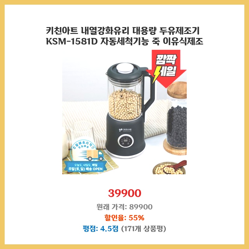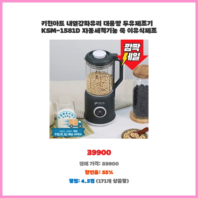 키친아트 내열강화유리 대용량 두유제조기 KSM-1581D 자동세척기능 죽 이유식제조