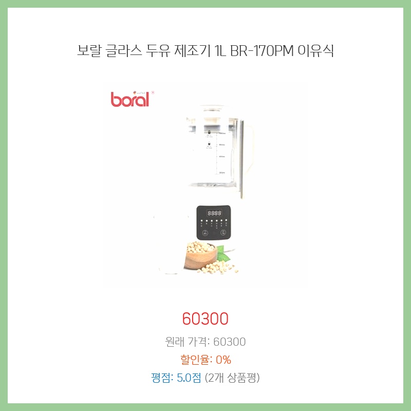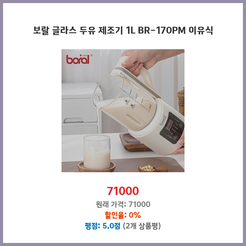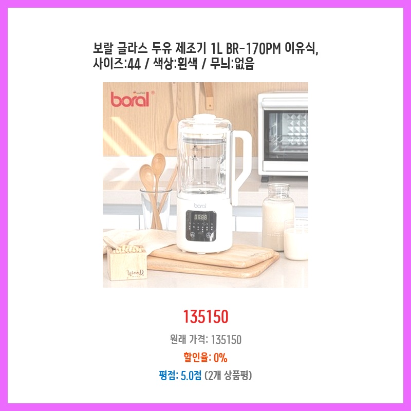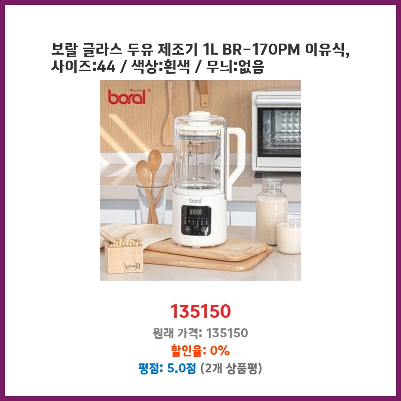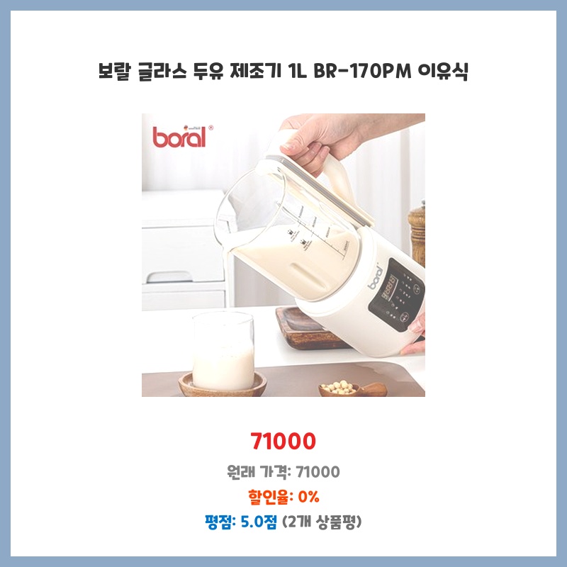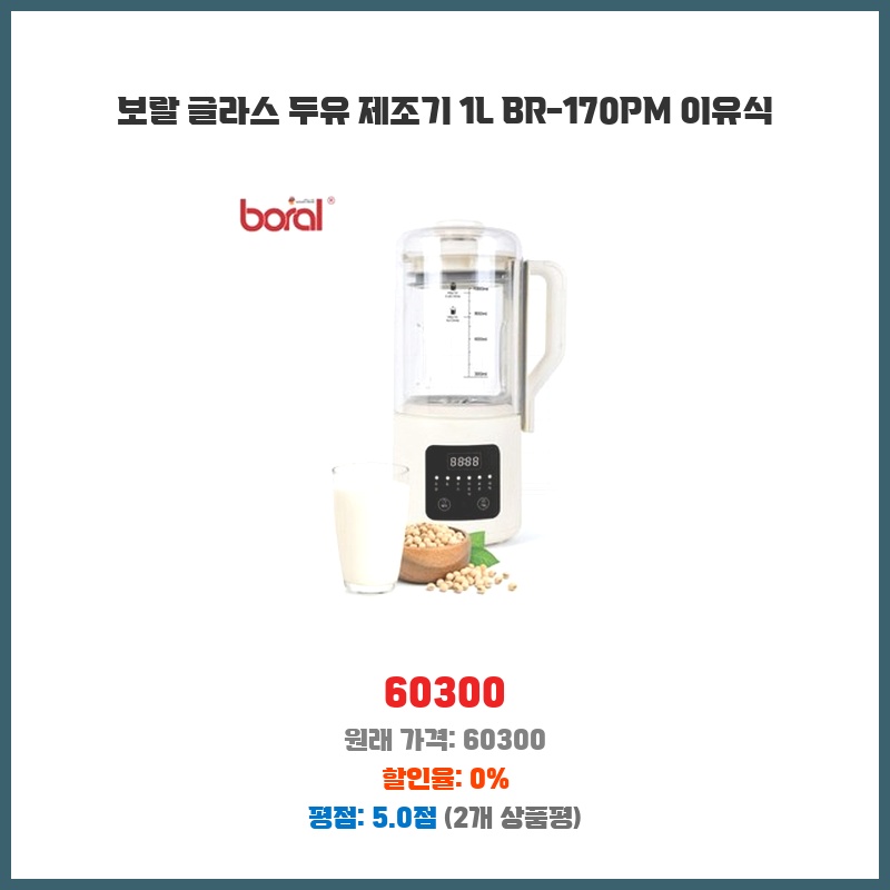 베스트 평점 보랄 글라스 두유 제조기 1L BR-170PM 이유식 사이즈:44 / 색상:흰색 / 무늬:없음 지갑이 가벼워지는 혜택