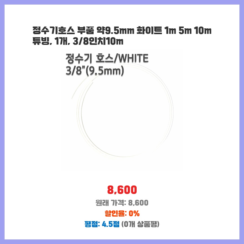 기존 정수기 호스가 오래되어 교체가 필요했습니다. 9.5mm 사이즈가 정확히 맞아서 좋았고, 1m, 5m, 10m 중 선택 가능한 점이 편리했습니다. 화이트 색상이라 깔끔하고, 38인치 호환으로 기존 제품과 무리 없이 연결되었습니다.