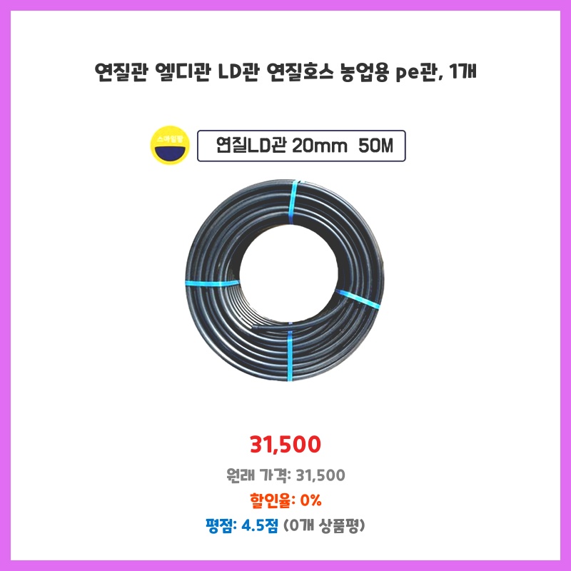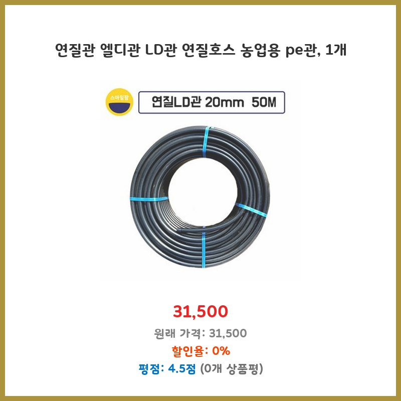 농업용 PE관이 필요했는데, 가격 대비 품질이 좋아 보였습니다. 내구성이 뛰어난 LDPE 소재라 오래 사용할 수 있을 것 같고, 직접 배송되어 편리했습니다. 길이도 적당해서 작업에 불편함이 없었습니다.