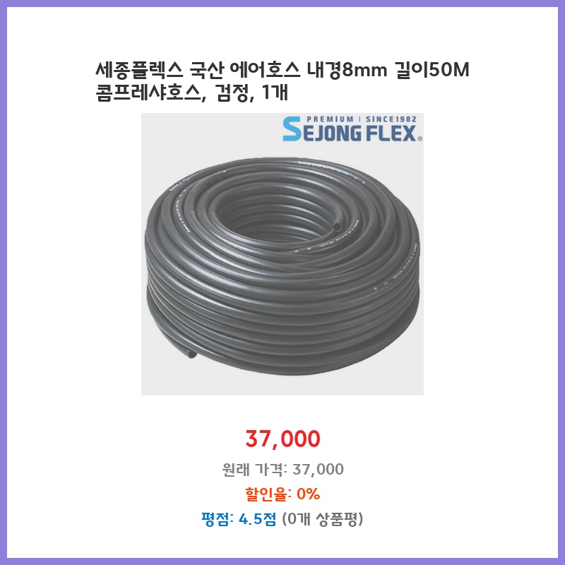 국산 제품이라 믿음직하고, 50m의 넉넉한 길이와 8mm 내경으로 작업 효율이 높아질 것 같아 구매했습니다. 검정색이라 오염도 덜 티 날 것 같고, 가격 대비 성능이 좋아 보였습니다.