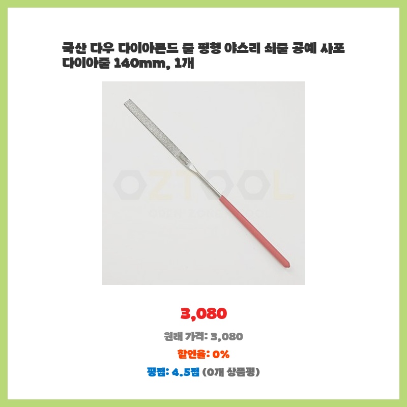 국산 다이아몬드 줄이라 믿을 수 있는 품질이 기대되어 구매했습니다. 140mm 길이로 작업하기에 적절한 크기이고, 다양한 공예 작업에 활용 가능할 것 같아 선택했습니다. 평형 야스리라 작업 시 안정성도 높을 것으로 예상됩니다.