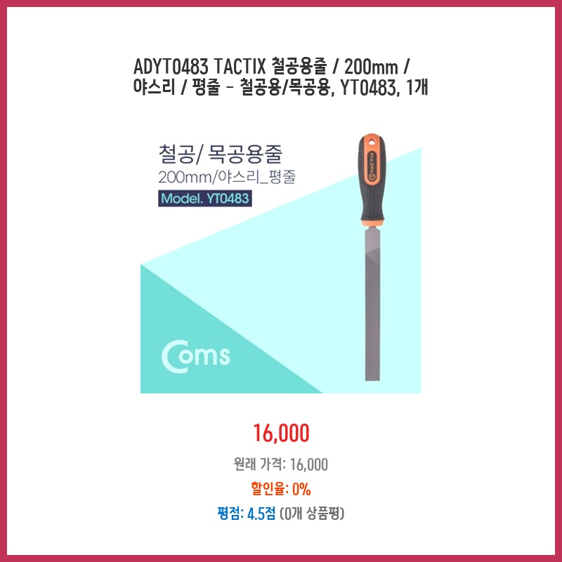 정밀한 작업이 필요해서 철공용 줄을 찾던 중, ADYT0483 TACTIX 야스리가 눈에 띄었습니다. 200mm 길이로 작업성이 좋아 보였고, 평줄이라 균일한 마무리가 가능할 것 같아 구매했습니다. 평판이 좋아 믿음직했습니다.