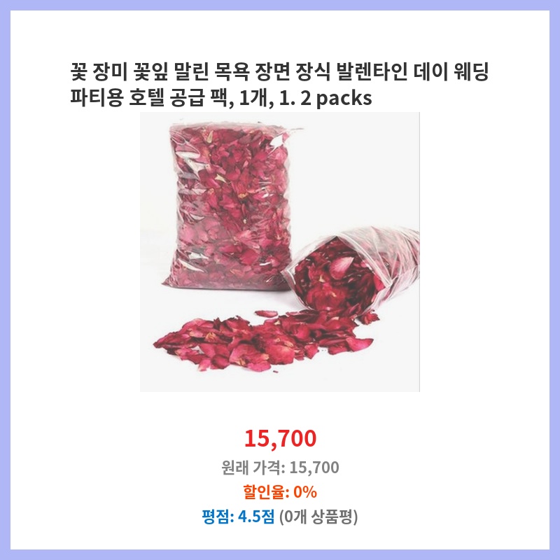 발렌타인데이 분위기를 내고 싶어서 장미 꽃잎을 찾던 중, 말린 꽃잎이라 편리하고 깔끔하게 사용할 수 있을 것 같아 구매했습니다. 웨딩이나 파티 장식에도 활용 가능하다는 점이 매력적이었습니다. 호텔 납품용이라 품질도 기대됩니다.