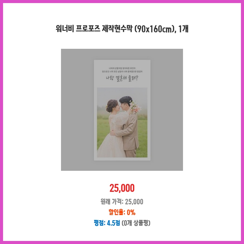 깔끔한 디자인과 적절한 크기(90x160cm)가 마음에 들었습니다. 프로포즈 현수막으로 사용하기에 충분한 크기이고, 가격 대비 품질이 좋아 만족스러웠습니다. 인쇄 품질도 괜찮았습니다.