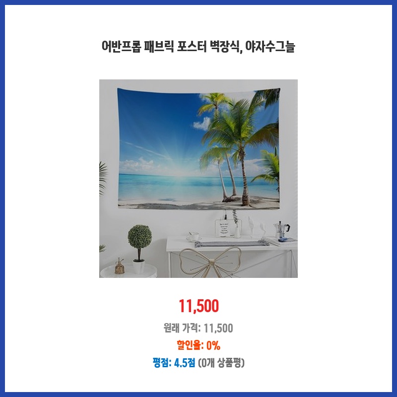 깔끔한 디자인과 적당한 크기가 마음에 들어 구매했습니다. 벽에 걸었을 때 공간이 훨씬 산뜻해 보이고, 가격 대비 만족스러운 품질입니다. 시원한 야자수 그림이 여름 분위기 연출에 좋네요.