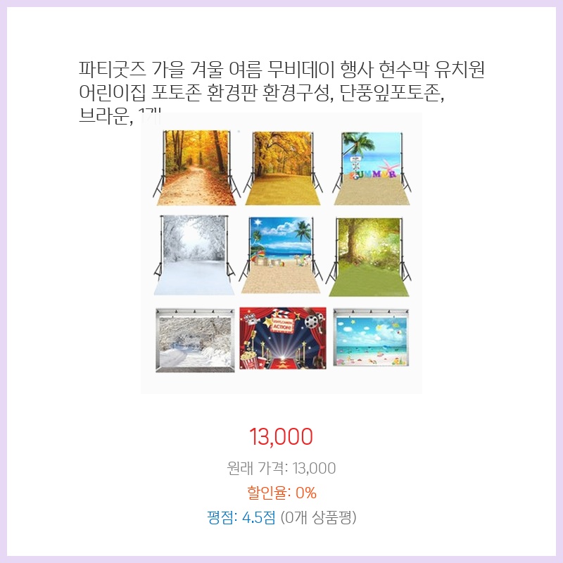유치원 가을 행사를 준비하며 포토존을 꾸밀 현수막이 필요했습니다. 브라운 색상의 단풍잎 디자인이 아이들 사진과 잘 어울릴 것 같아 구매했습니다. 가격 대비 퀄리티가 좋아 보였고, 설치도 간편할 것 같았습니다.