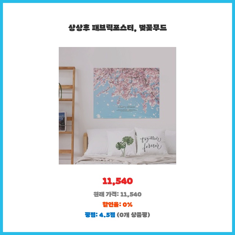 벚꽃 디자인이 예뻐서 방 분위기를 바꾸고 싶어 구매했습니다. 패브릭 소재라 부드러운 느낌이 좋고, 가볍게 걸 수 있어 편리합니다. 가격도 적당한 편이라고 생각합니다.