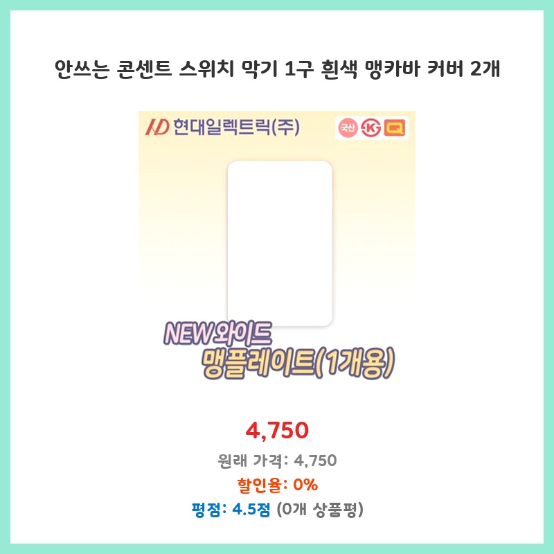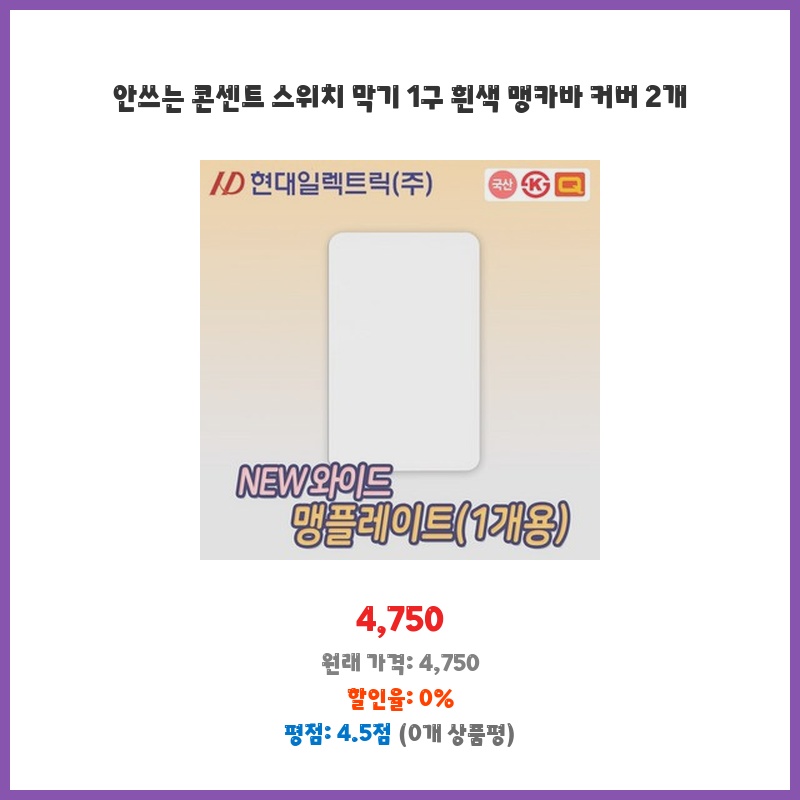 깔끔한 화이트 색상과 덮개형 디자인이 마음에 들어 구매했습니다. 기존 스위치가 노출되어 보기 싫었는데, 깔끔하게 가려주고 인테리어 효과도 좋습니다. 설치도 간편해서 좋았습니다.