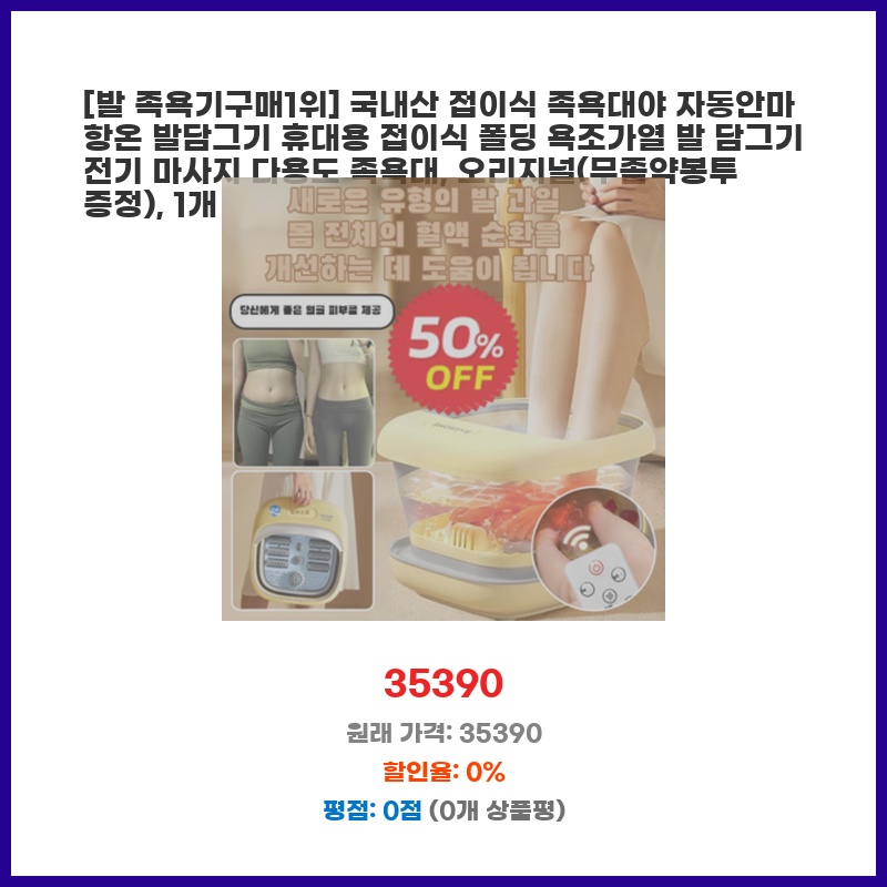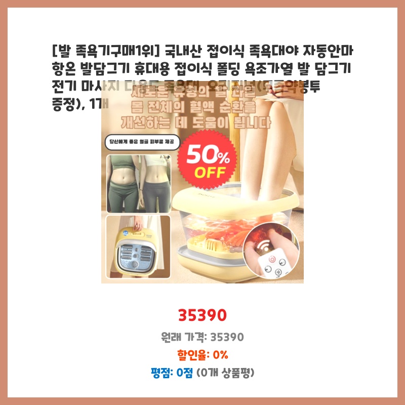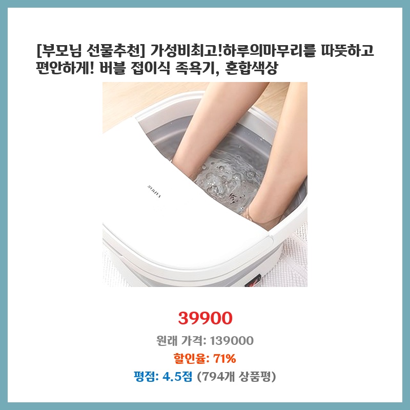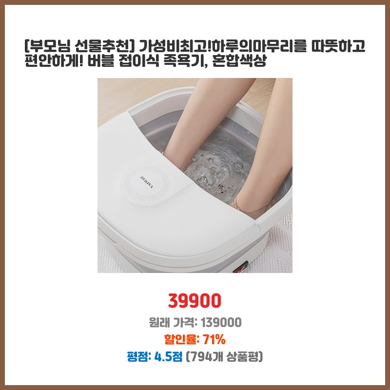 부모님께서 퇴근 후 발이 자주 저리다고 하셔서 선물했습니다. 접이식이라 보관도 편하고, 가격도 부담없어 가성비가 좋다고 생각합니다. 따뜻한 물에 발을 담그니 피로가 풀리는지 좋아하시네요.