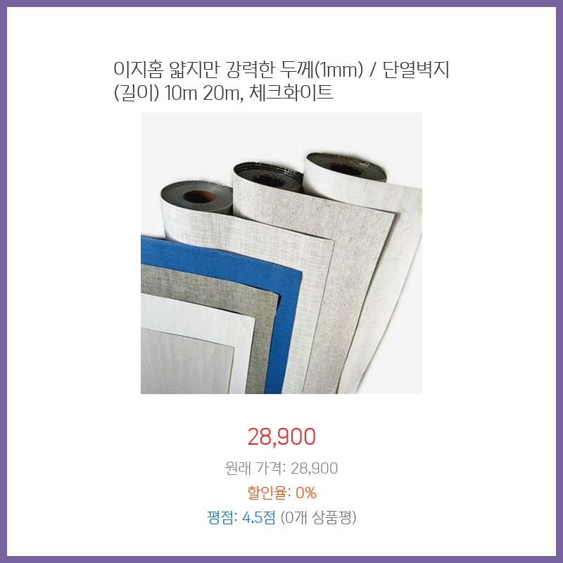 겨울철 난방비 절약과 여름철 시원함을 위해 단열벽지를 찾던 중, 얇지만 1mm의 두께로 부착이 간편하고 효과적인 이지홈 제품을 선택했습니다. 체크화이트 패턴도 마음에 들었고, 10m20m 선택 폭도 좋았습니다.