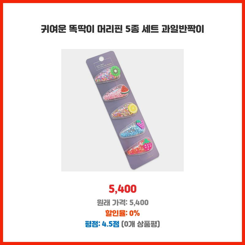 5종 세트라 다양하게 활용 가능하고, 과일 모양에 반짝이까지 더해져 귀엽고 포인트 주기에 좋아서 구매했습니다. 가격도 부담스럽지 않아 여러 개 구매해도 좋을 것 같아요. 머리핀 퀄리티도 괜찮아 보였습니다.