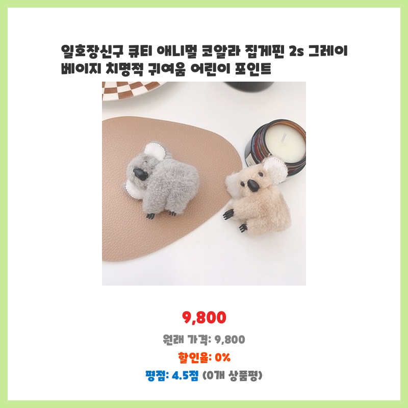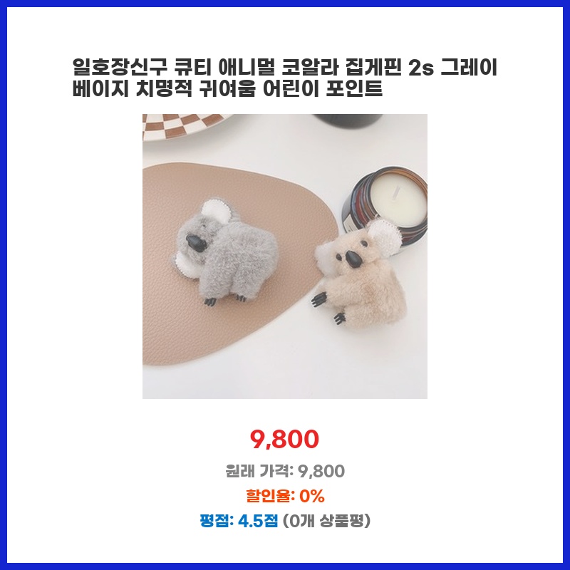 아이가 코알라를 너무 좋아해서 집게핀을 찾던 중 디자인이 깔끔하고 귀엽다는 생각에 구매했습니다. 실제 제품도 사진과 거의 같았고, 튼튼해서 자주 사용하고 있습니다. 머리숱이 적은 아이에게도 잘 고정됩니다.