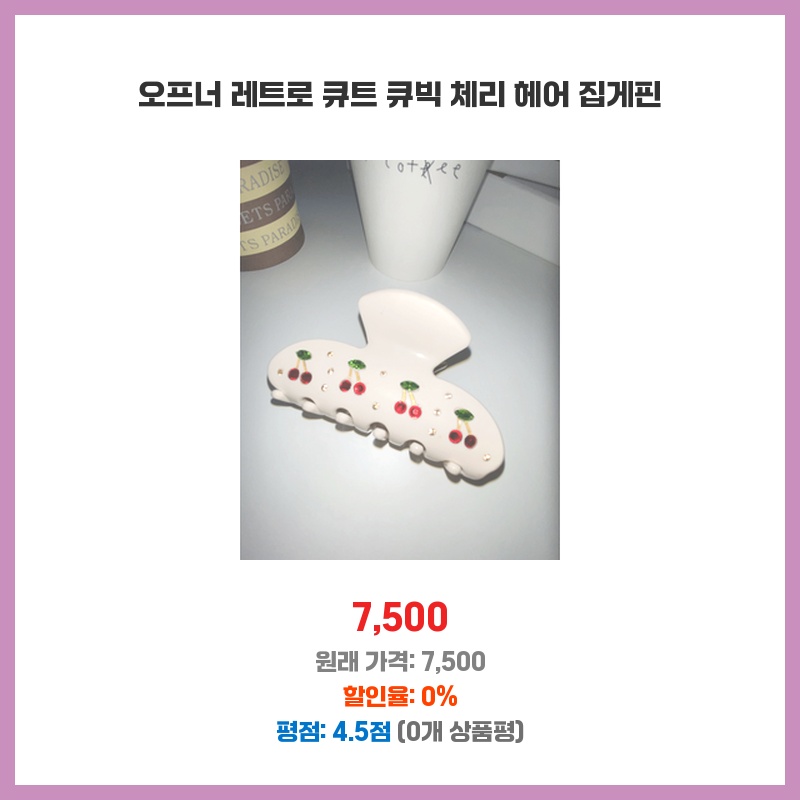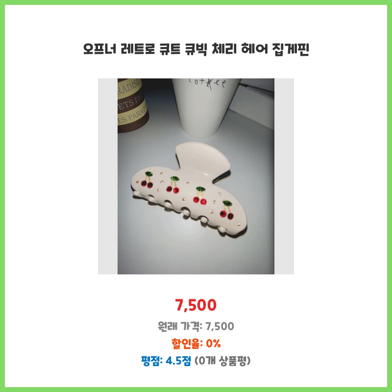 레트로 디자인이 너무 귀엽고, 큐빅 체리가 포인트가 되어 심플한 헤어스타일에 포인트를 줄 수 있을 것 같아 구매했습니다. 크기도 적당하고, 튼튼해 보여 오래 사용할 수 있을 것 같습니다.