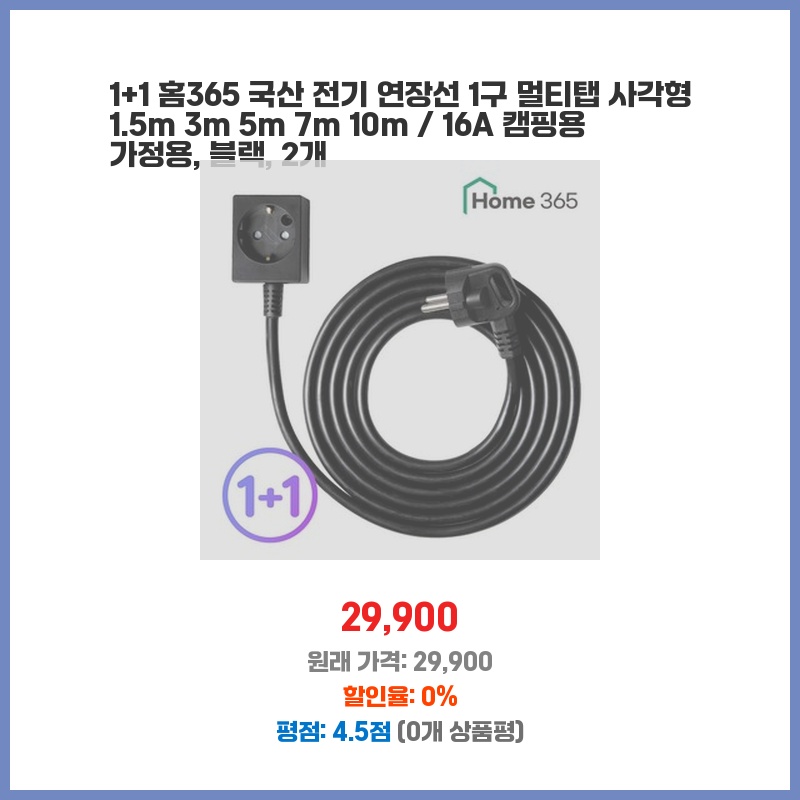1+1 홈365 국산 전기 연장선 1구 멀티탭 사각형 1.5m 3m 5m 7m 10m / 16A 캠핑용 가정용, 블랙, 2개