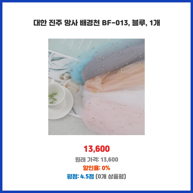 촬영 배경으로 고급스러운 분위기를 연출하고 싶어서 구매했습니다. 진주 장식이 은은하게 빛나고, 망사 소재라 다양한 소품과 잘 어울릴 것 같아 선택했습니다. 블루 색상도 시원하고 예쁩니다.