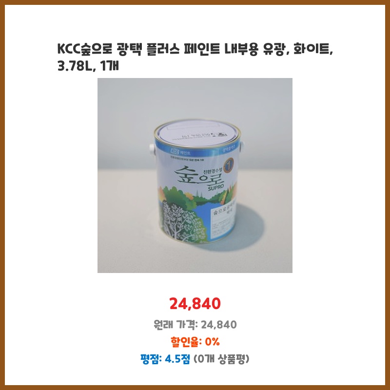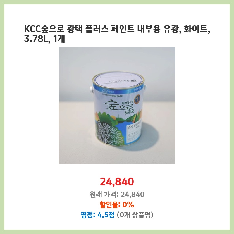 깨끗하고 화사한 분위기를 원해서 KCC숲으로 광택 플러스 페인트를 선택했습니다. 내부용 유광이라 깔끔하고 관리가 용이할 것 같아 기대됩니다. 국내 유명 브랜드라 믿음직스러웠습니다.