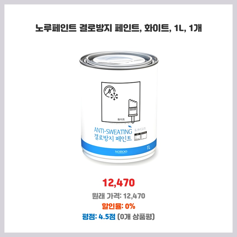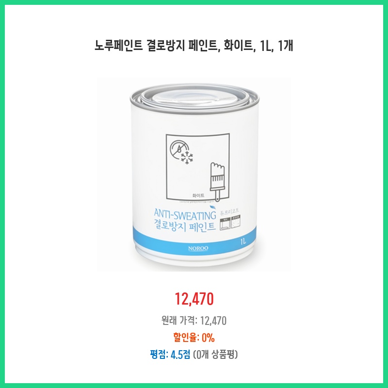 겨울철 습기로 인한 벽면 결로가 심해져서 페인트를 알아보던 중, 노루페인트 결로방지 페인트의 효과에 대한 후기가 좋아 구매했습니다. 1L 용량으로 소량 작업에 적합하고, 화이트 색상이라 어떤 인테리어에도 잘 어울릴 것 같았습니다.
