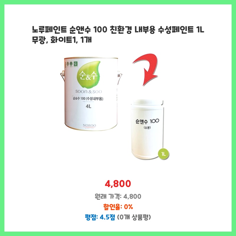 노루페인트 순앤수 100 친환경 내부용 수성페인트 1L 무광, 화이트1, 1개