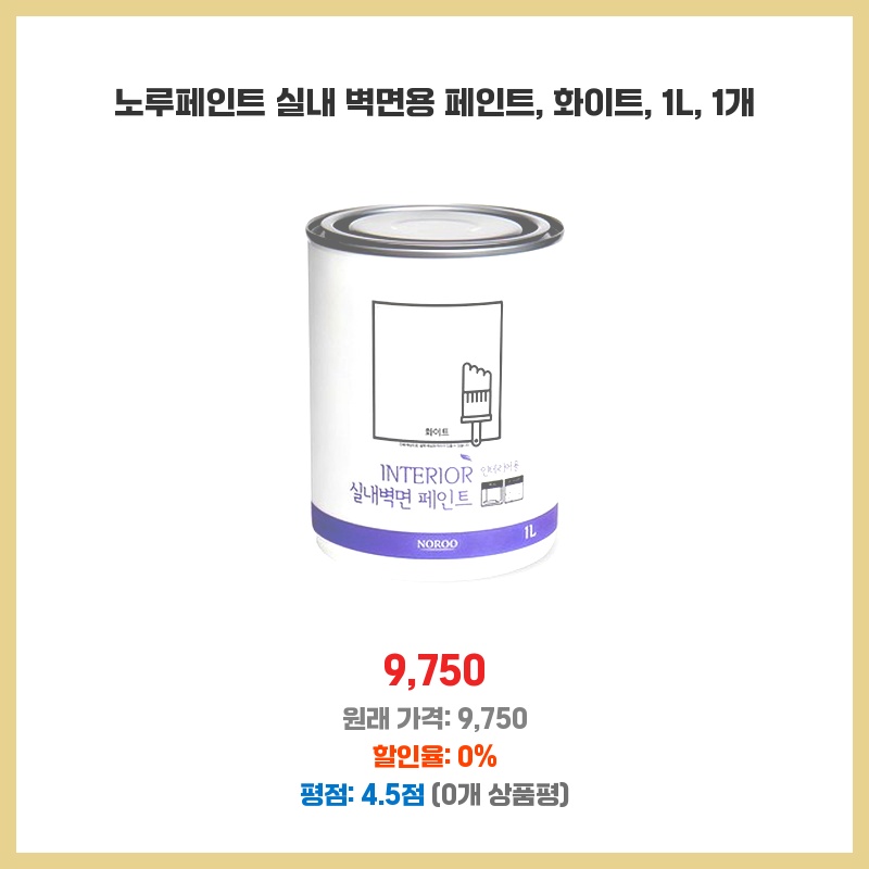 셀프 인테리어를 위해 깨끗한 화이트 벽을 원했고, 노루페인트의 믿을 수 있는 품질과 1L 소용량으로 부담 없이 사용하기 좋을 것 같아 구매했습니다. 깔끔한 마감이 기대됩니다.