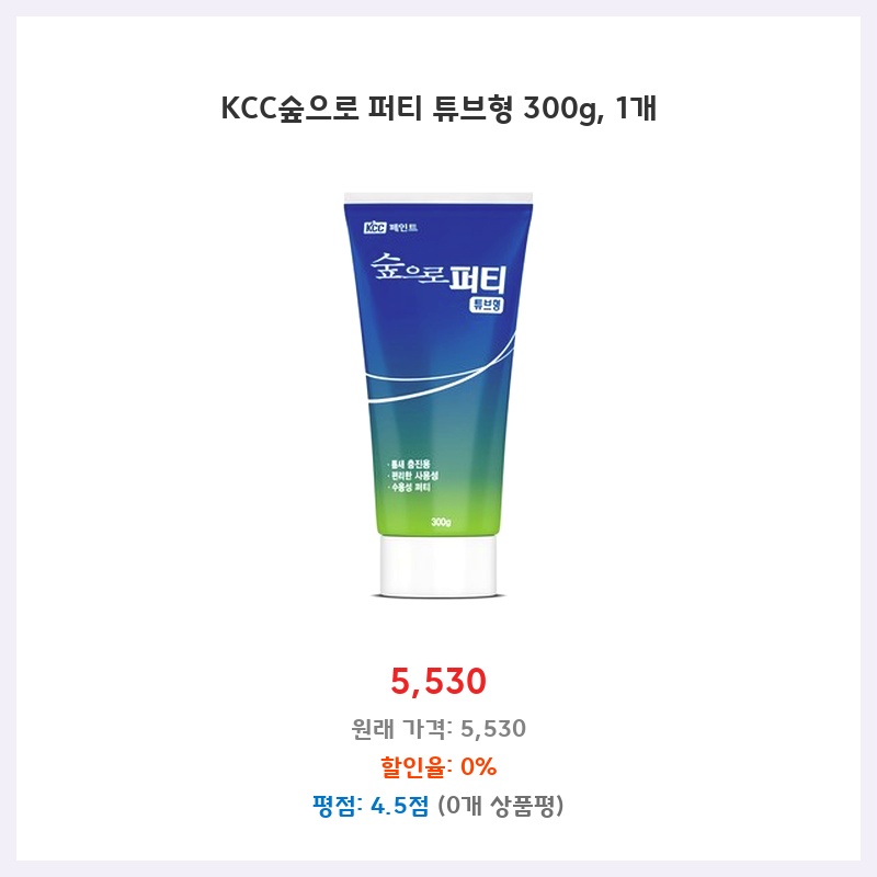튜브형이라 사용이 편리하고, 300g 용량으로 넉넉하게 사용할 수 있어서 구매했습니다. KCC 제품이라 믿을 수 있는 품질이라는 점도 구매 결정에 영향을 미쳤습니다. 작은 흠집이나 틈 메우기에 적합해 보였습니다.