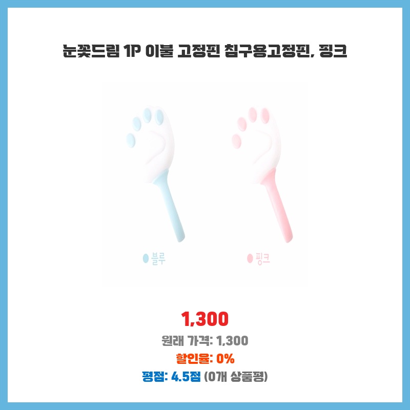 이불이 자꾸 밀리는게 신경쓰여서 구매했습니다. 1,300원이라는 저렴한 가격에 핑크색상도 예뻐서 망설임 없이 구매했어요. 핀이 튼튼해 보여서 오래 사용할 수 있을 것 같습니다.
