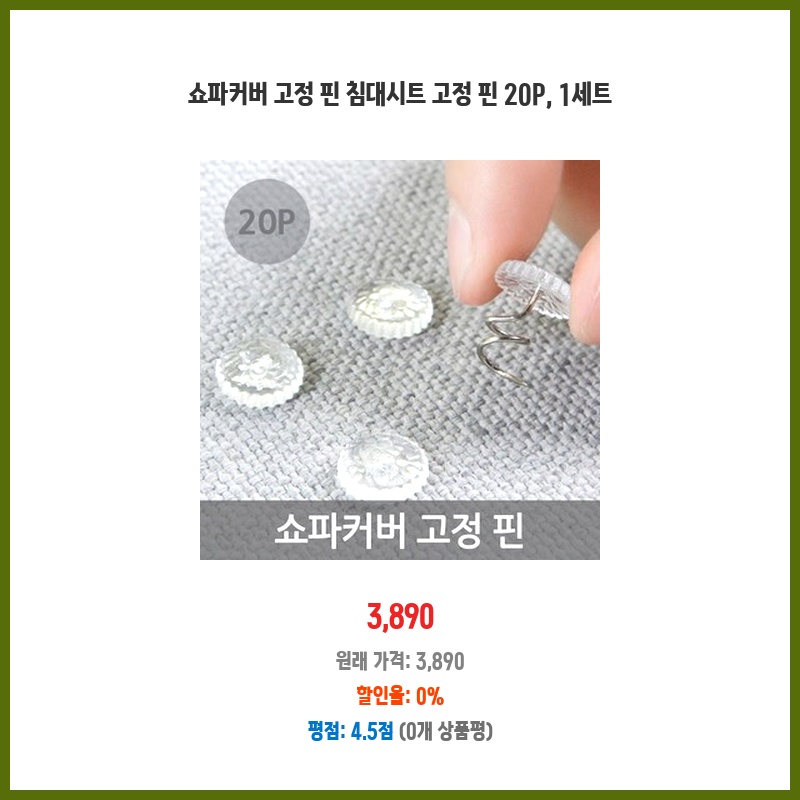 쇼파나 침대 시트가 자꾸 밀리는게 스트레스였는데, 핀으로 고정하면 깔끔하게 정돈되고 보기 좋을 것 같아서 구매했습니다. 20개나 들어있어서 여러 곳에 사용할 수 있는 점도 좋았습니다. 가격도 부담없어서 좋네요.