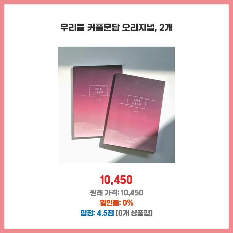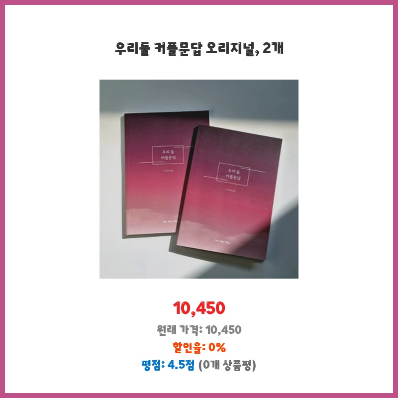 연인과의 소통을 더욱 즐겁게 하고 싶어서 구매했습니다. 2개 세트라 서로 질문하고 답하며 편하게 이야기 나눌 수 있는 점이 좋았습니다. 질문의 종류도 다양해서 지루하지 않았어요.