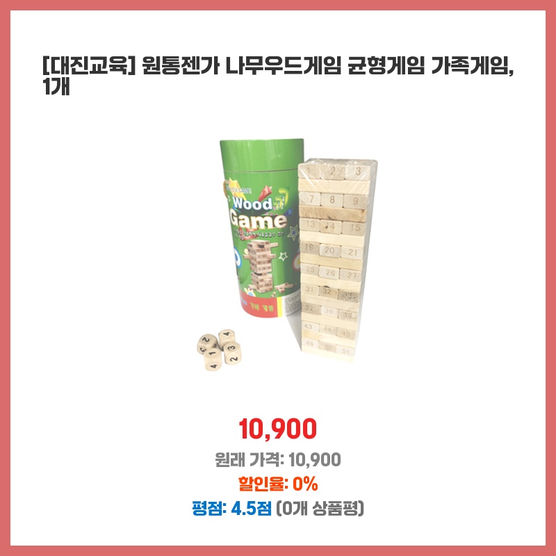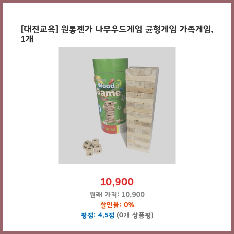 아이들과 함께 즐길 수 있는 보드게임을 찾던 중, 원목 소재의 젠가가 눈에 띄었습니다. 튼튼하고 안전해 보였고, 집중력과 손재주 향상에도 도움이 될 것 같아 구매했습니다. 깔끔한 디자인도 마음에 들었습니다.