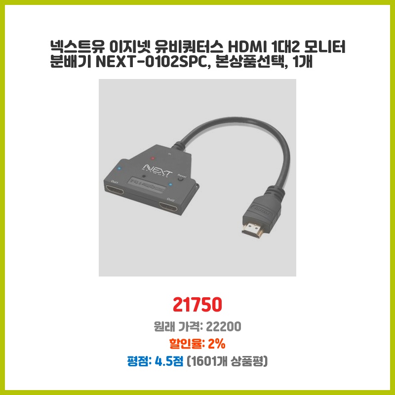 넥스트유 이지넷 유비쿼터스 HDMI 1대2 모니터 분배기 NEXT-0102SPC, 본상품선택, 1개