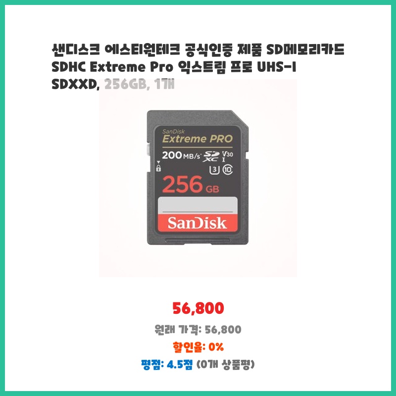 실시간 인기 샌디스크 에스티원테크 공식인증 제품 SD메모리카드 SDHC Extreme Pro 익스트림 프로 UHS-I SDXXD 256G... 포인트 쏠쏠한 제품