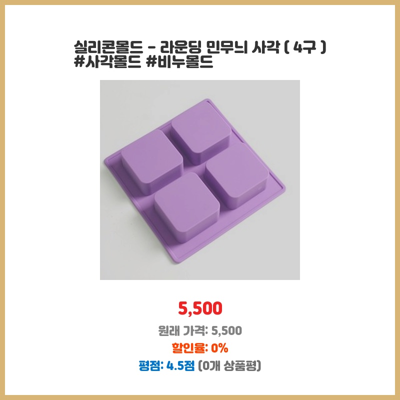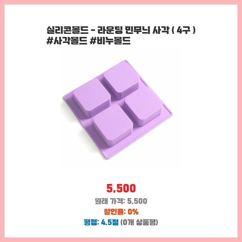 깔끔한 디자인의 사각 비누를 만들고 싶어서 구매했습니다. 4구라 한 번에 여러 개 만들 수 있어 효율적이고, 실리콘 재질이라 탈형도 쉽다는 점이 좋았습니다. 민무늬라 제가 원하는 장식을 추가하기에도 편리할 것 같습니다.