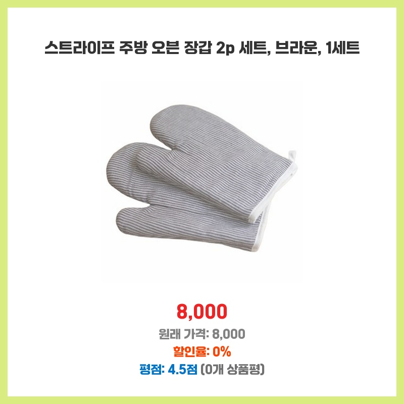 기존 오븐 장갑이 낡아서 새로 구매했습니다. 브라운 색상이 주방 분위기와 잘 어울리고, 2개 세트라 하나는 사용하고 하나는 세탁하는 데 유용할 것 같아서 선택했습니다. 넉넉한 사이즈와 깔끔한 스트라이프 디자인도 마음에 들었습니다.