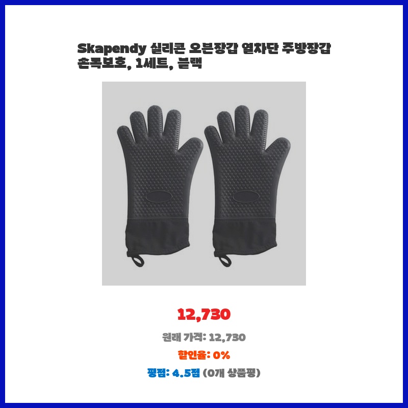 기존 오븐장갑이 불편하고 열 전달이 빨라 새로운 장갑이 필요했습니다. Skapendy 실리콘 오븐장갑은 손목까지 보호하는 디자인과 실리콘 소재의 내구성이 마음에 들었습니다. 열 차단 효과도 기대 이상입니다.