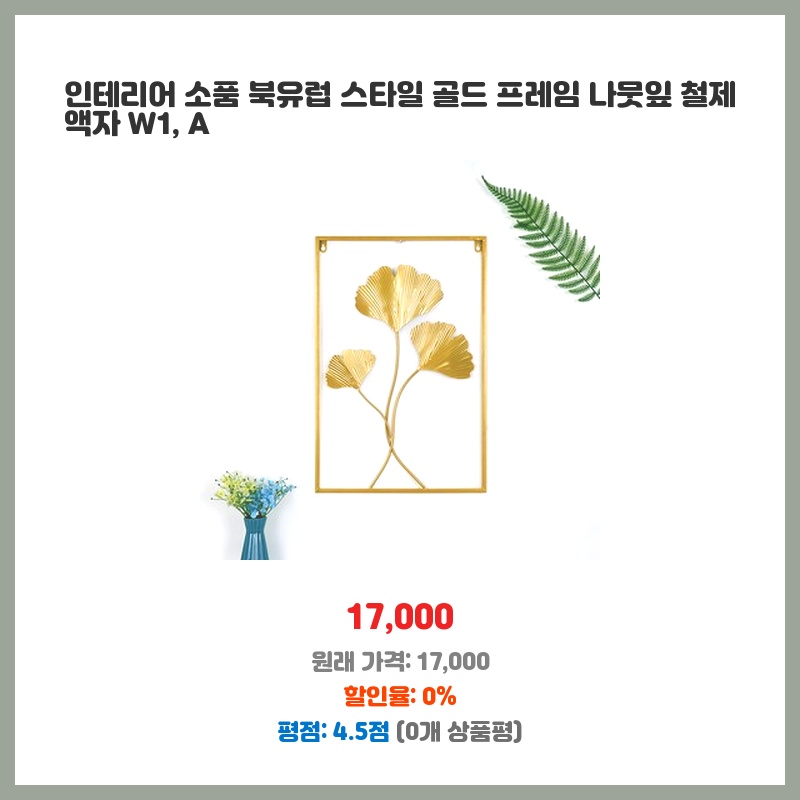 심플하면서도 고급스러운 북유럽 스타일이 마음에 들었어요. 골드 프레임과 나뭇잎 디자인의 조화가 예뻐서 거실에 포인트 소품으로 활용하려고 구매했습니다. 철제 소재라 튼튼하고, 생각보다 무게감이 있어 안정적입니다.