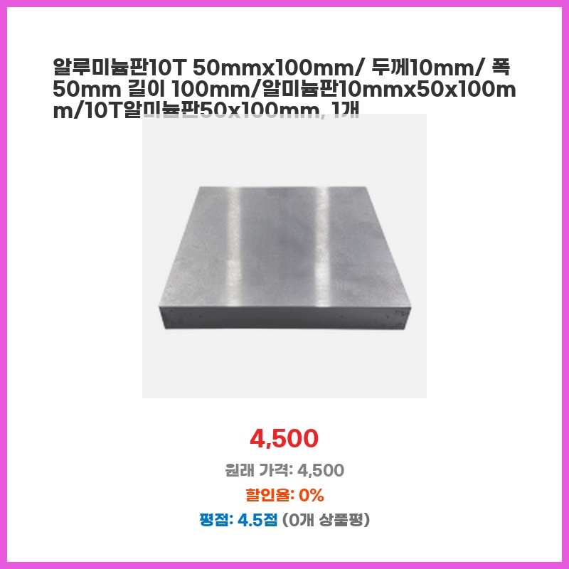 소형 프로젝트에 필요한 알루미늄 판을 찾던 중, 정확한 사이즈(50x100mm)와 두께(10mm)가 저렴한 가격에 제공되어 구매했습니다. 가공이 용이한 알루미늄 소재라 작업하기 편리할 것 같았습니다.