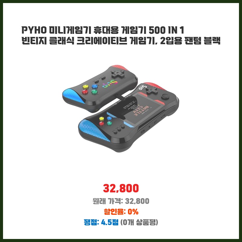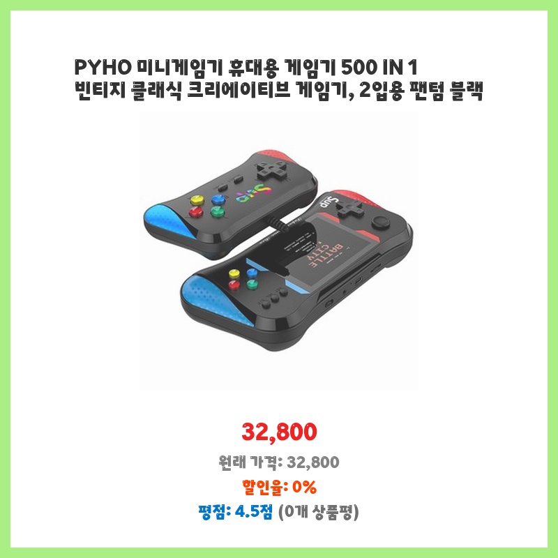 휴대성이 좋아 언제 어디서든 500가지 게임을 즐길 수 있어 구매했습니다. 어릴 적 추억의 게임들이 많아 좋았고, 2개씩 있어 친구와 함께 즐길 수 있는 점도 매력적이었습니다. 가격 대비 게임 수가 많아 만족스러웠습니다.