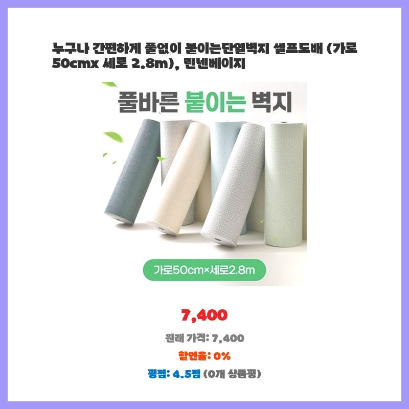 셀프 인테리어 초보라도 쉽게 벽지 시공이 가능하다는 점이 매력적이었습니다. 풀칠 없이 간편하게 붙일 수 있고, 린넨베이지 색상도 제가 원하던 분위기와 잘 맞아서 구매했습니다. 합리적인 가격도 만족스러웠습니다.