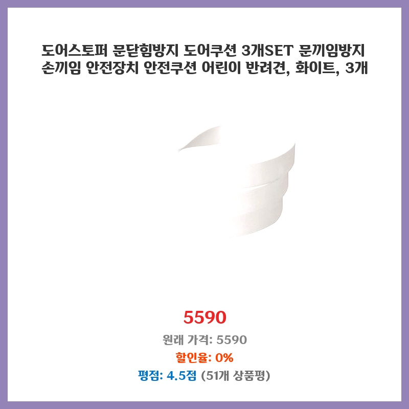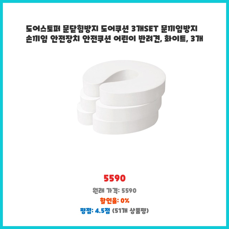 아이가 문에 손가락을 끼는 사고를 방지하고 싶어서 구매했습니다. 깔끔한 화이트 색상에 3개 세트라 여러 문에 설치하기 좋고, 부드러운 쿠션 소재라 안전해 보였습니다. 가격도 부담스럽지 않아서 만족스러웠습니다.