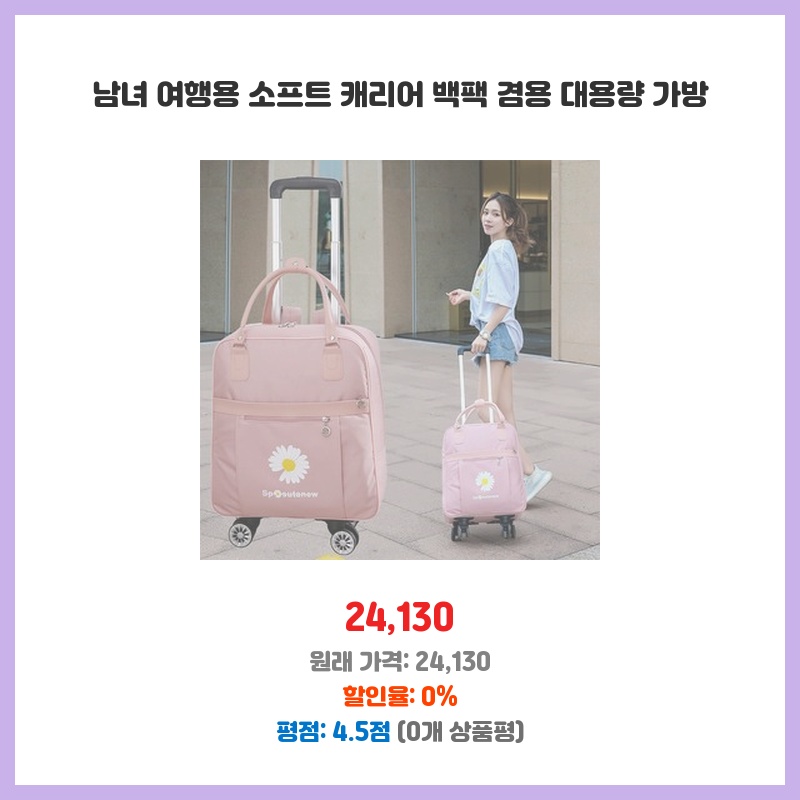 여행 다녀왔는데 정말 편했습니다! 등에 메고 다닐 수도 있고, 바퀴로 이동도 가능해서 좋았어요. 생각보다 튼튼하고, 수납공간도 넓어서 만족합니다.