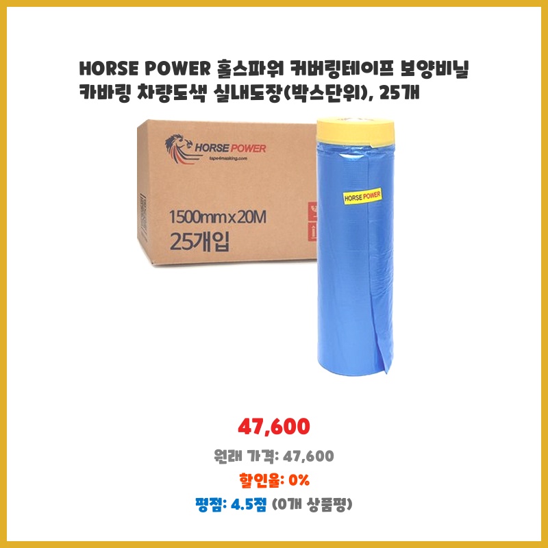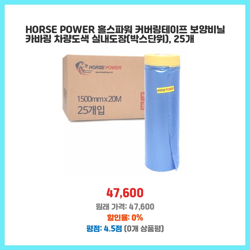 차량 도색 작업을 앞두고 있어 보양 작업에 필요한 커버링 테이프를 찾던 중, 박스 단위로 저렴하게 구매할 수 있어서 선택했습니다. 25개면 작업량에 충분하고, 홀스파워 제품은 품질도 괜찮다는 평이 많아서 구매했습니다.