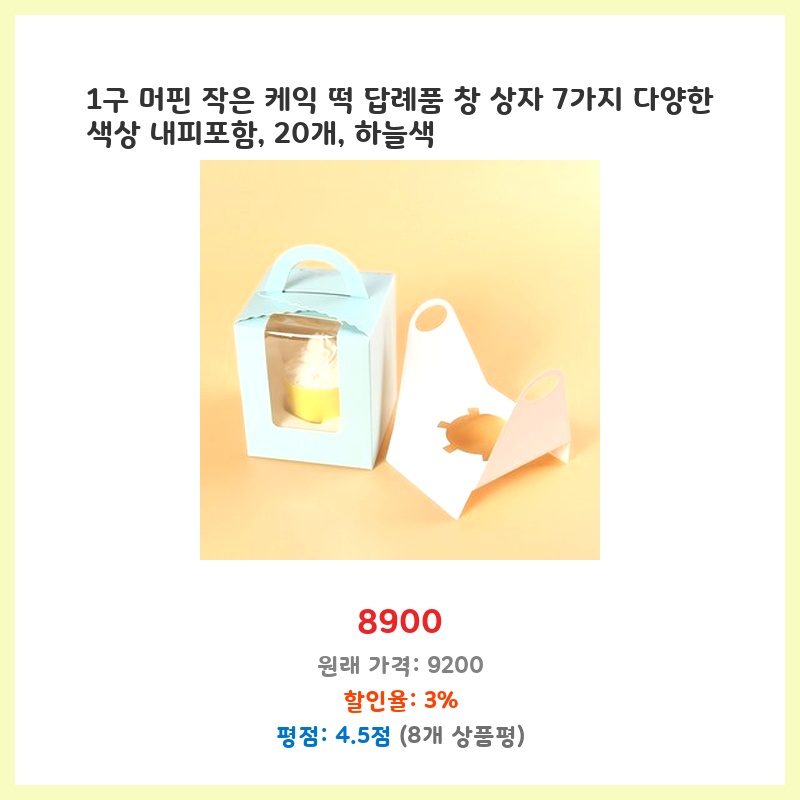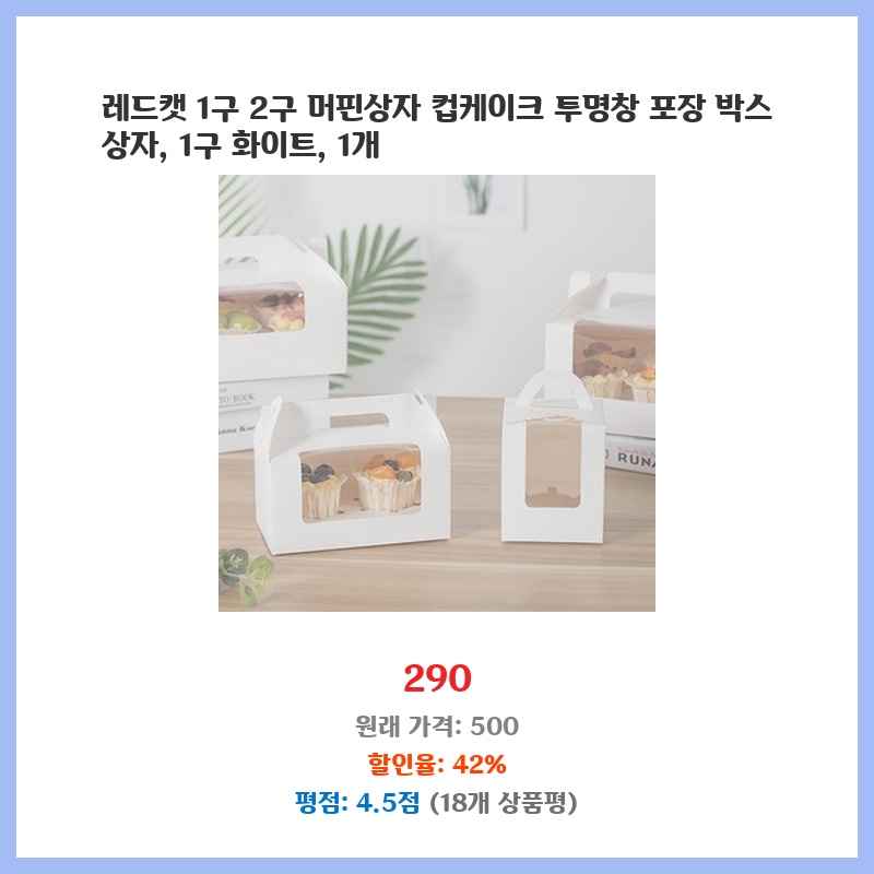 깔끔한 디자인과 투명창으로 컵케이크가 잘 보여 판매용으로 적합할 것 같아 구매했습니다. 가격도 저렴하고 1개만 구매 가능해서 부담 없었어요. 화이트 색상이라 어떤 컵케이크에도 잘 어울릴 것 같습니다.