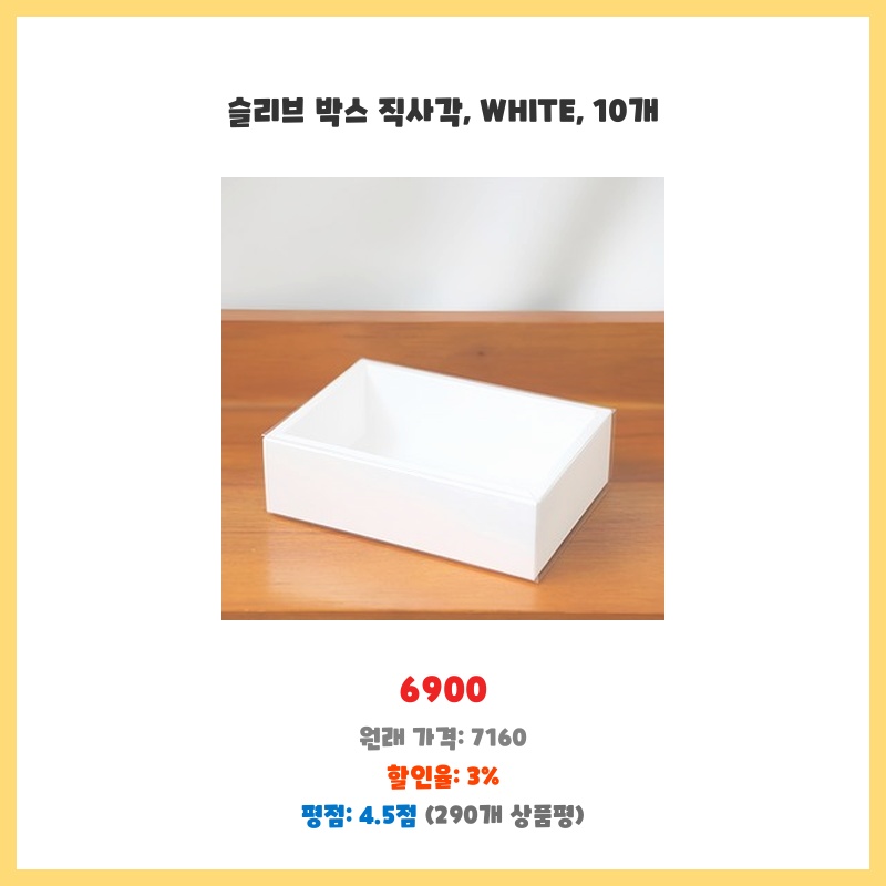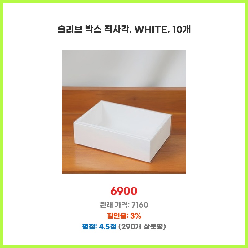 깔끔한 화이트 색상에 10개들이라 가성비가 좋습니다. 직사각형이라 다양한 물건을 담기에 편리하고, 슬리브 형태라 포장도 간편할 것 같아 구매했습니다. 선물 포장이나 소품 정리에 유용할 것 같습니다.