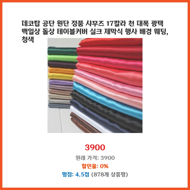 백일상을 준비하면서 고급스러운 테이블커버를 찾던 중, 데코탑 공단 원단의 고급스러운 광택과 다양한 색상에 끌려 구매했습니다. 가격도 저렴하고 17가지 색상 중 선택의 폭이 넓어 좋았습니다. 실크 느낌의 부드러운 촉감도 마음에 들었습니다.
